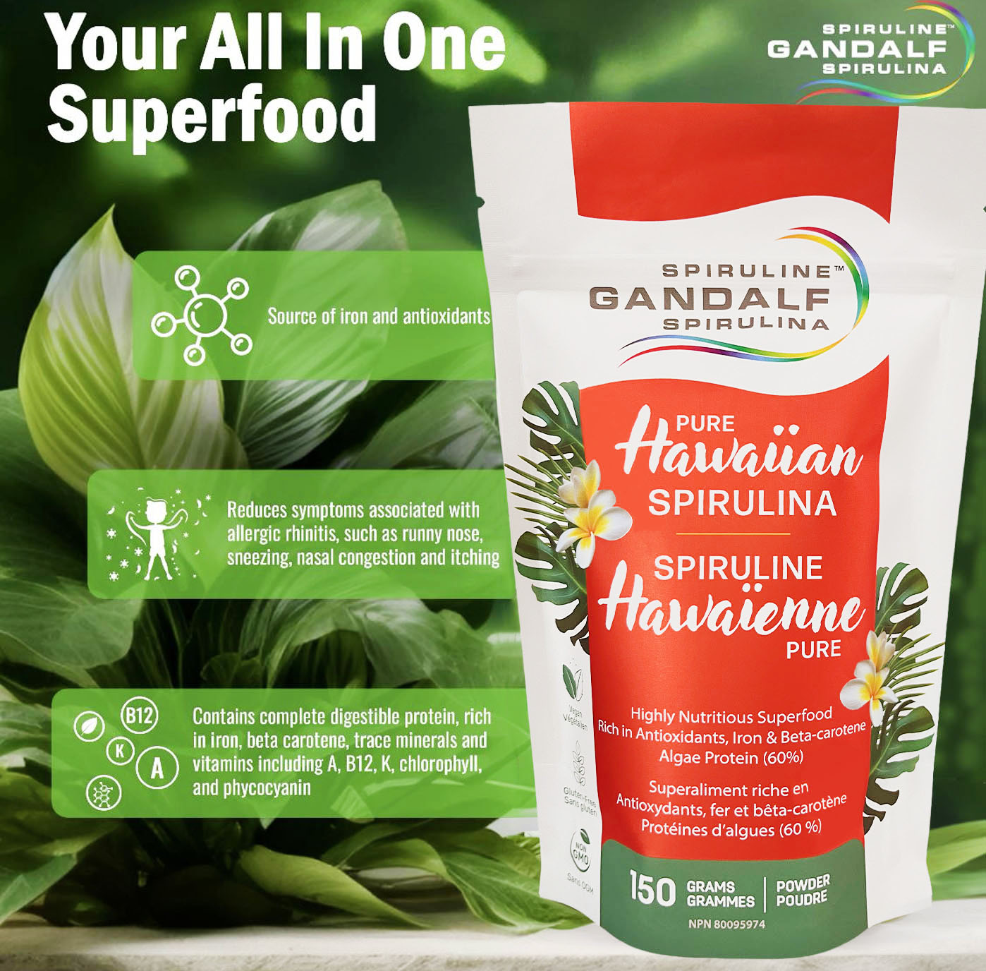 Gandalf Hawaiian spirulina™ is one of the most nutrient-rich superfoods on the planet. Plant-based in origin, spirulina boasts the superpowers of algae and is a natural source of: