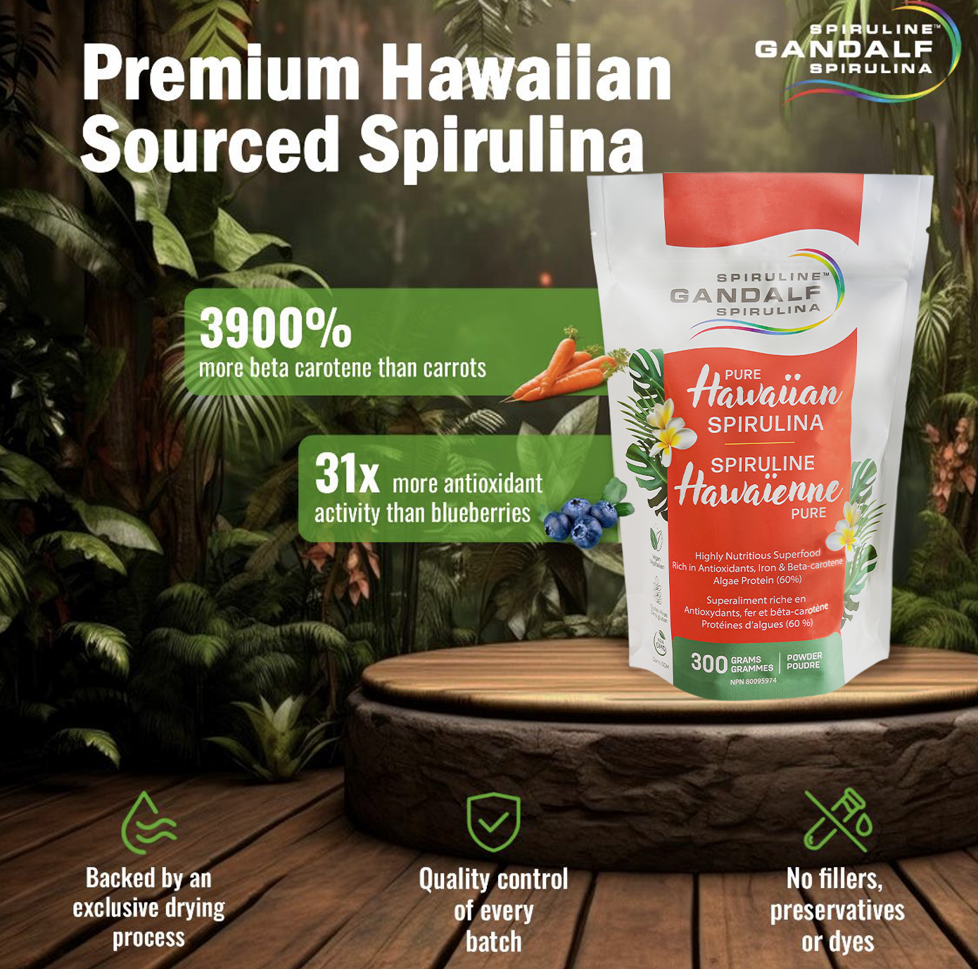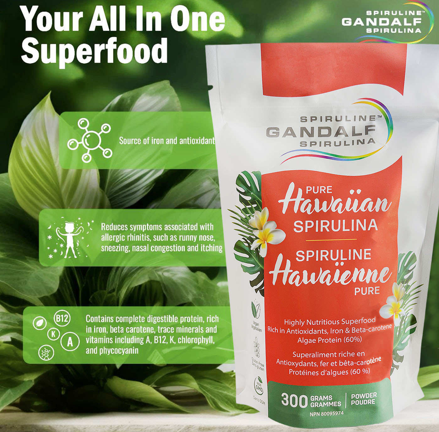 Gandalf Hawaiian spirulina™ is one of the most nutrient-rich superfoods on the planet. Plant-based in origin, spirulina boasts the superpowers of algae and is a natural source of: